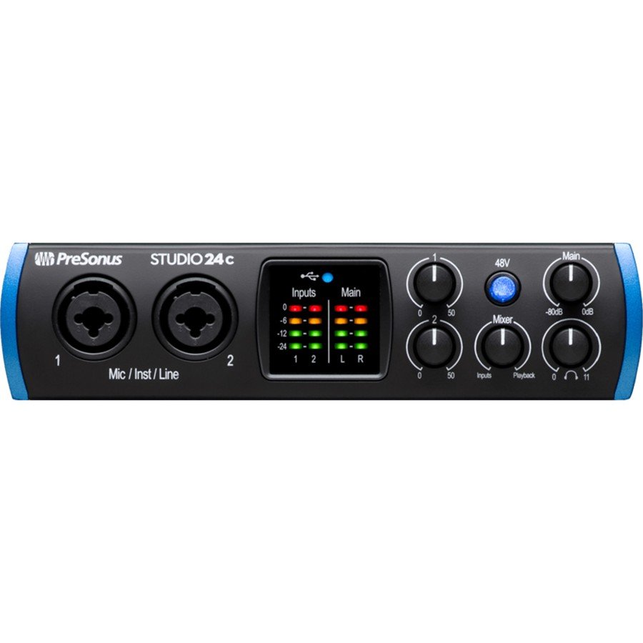The PreSonus Studio 24c is a professional 2×2 USB-C audio interface designed for musicians, producers, and content creators who demand pristine sound and reliable performance. Featuring two high-headroom XMAX-L mic preamps and 24-bit/192 kHz converters, the Studio 24c delivers studio-quality recordings with impressive clarity and detail. Its compact and rugged design makes it perfect for home studios or mobile setups, while the direct monitoring knob allows for zero-latency tracking. Equipped with MIDI I/O, balanced ¼” TRS outputs, and a powerful headphone amp, this interface integrates seamlessly with macOS and Windows systems. Included is the award-winning PreSonus Studio One Artist DAW and a suite of creative software to get you recording right out of the box.