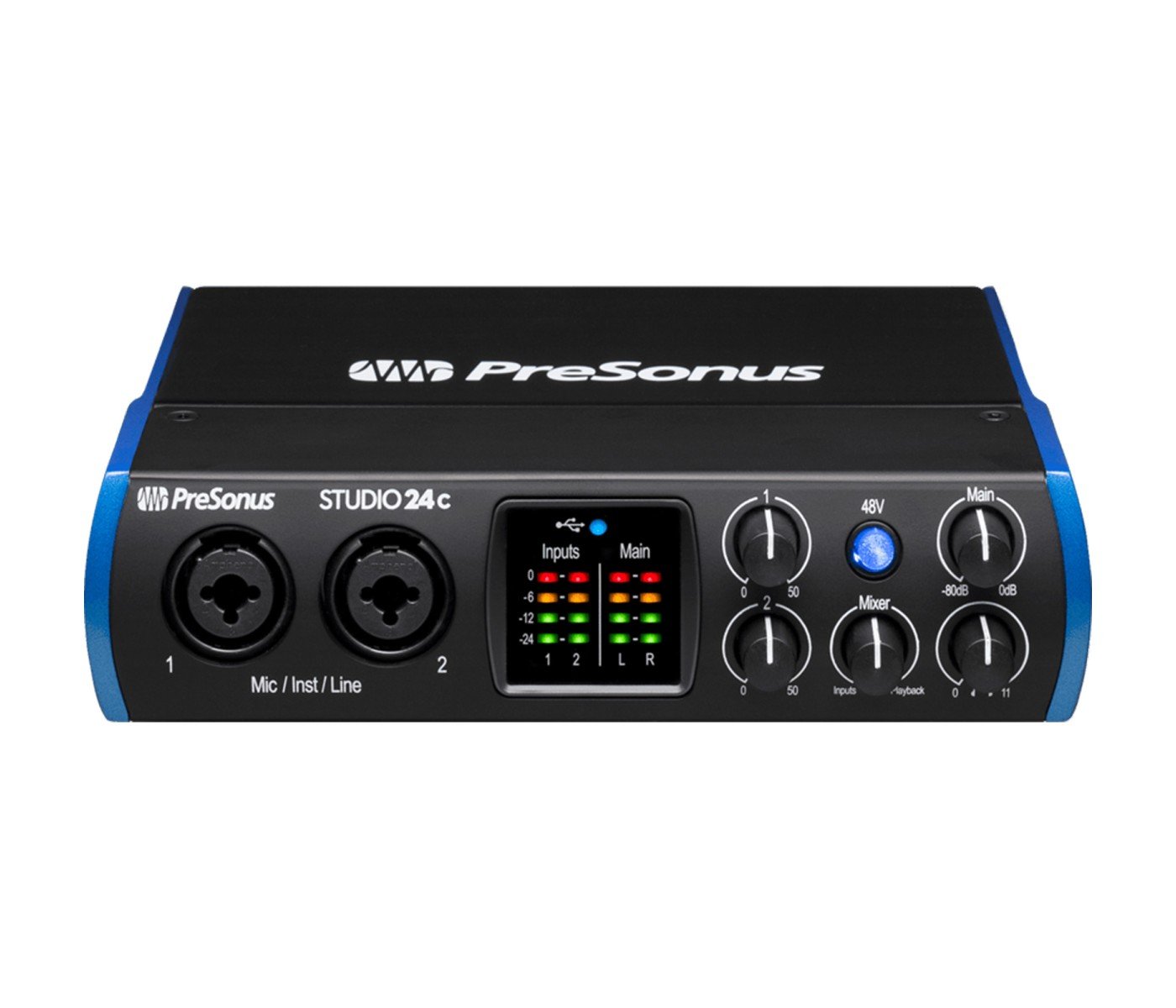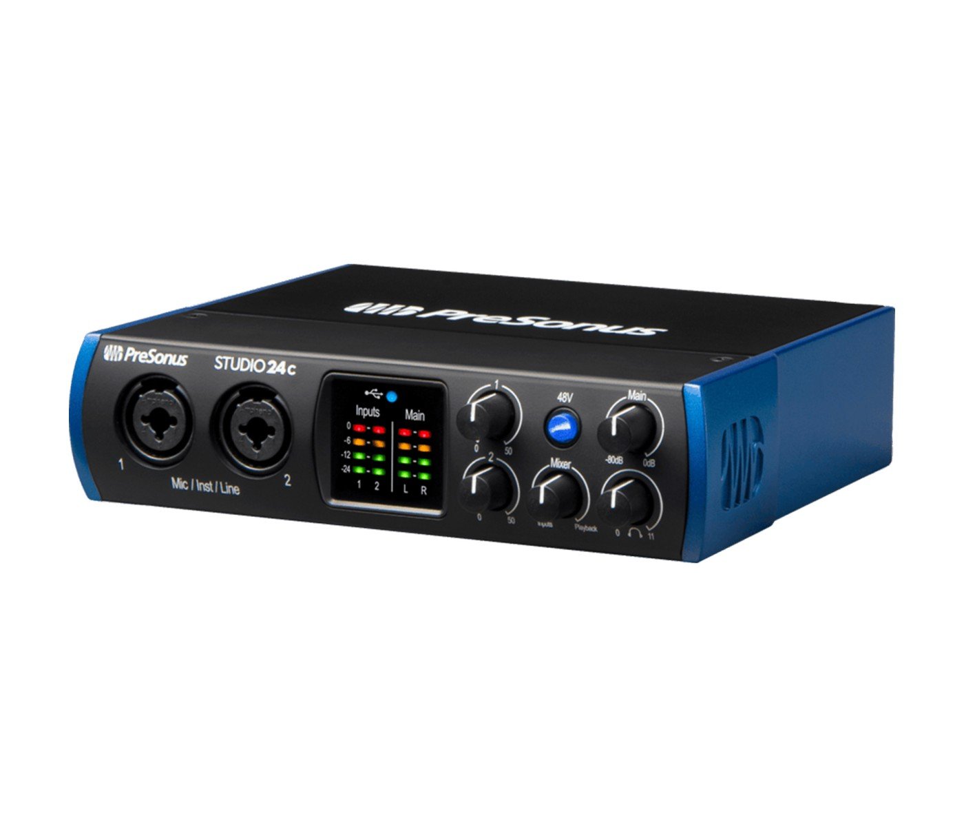Whether you’re recording your first album or your hit podcast’s latest episode, the Studio 24c will help you sound your best. With two of PreSonus®’ pristine XMAX-L mic preamps for recording vocals, high-headroom instrument preamps so you can connect your guitar or bass directly to your interface, and professional input metering so you can keep track of your recording levels, the Studio 24c delivers amazing sound quality in a rugged, compact form factor.