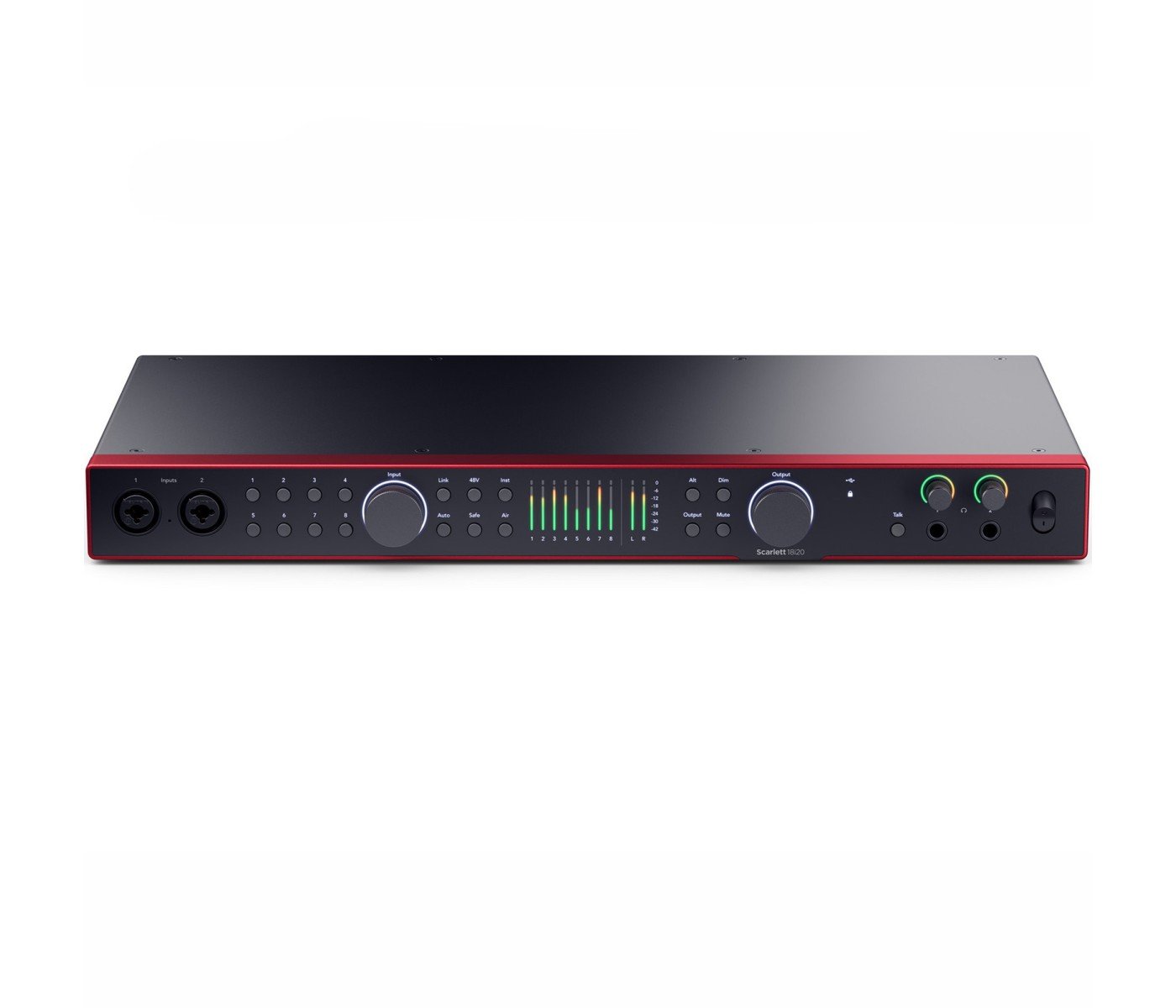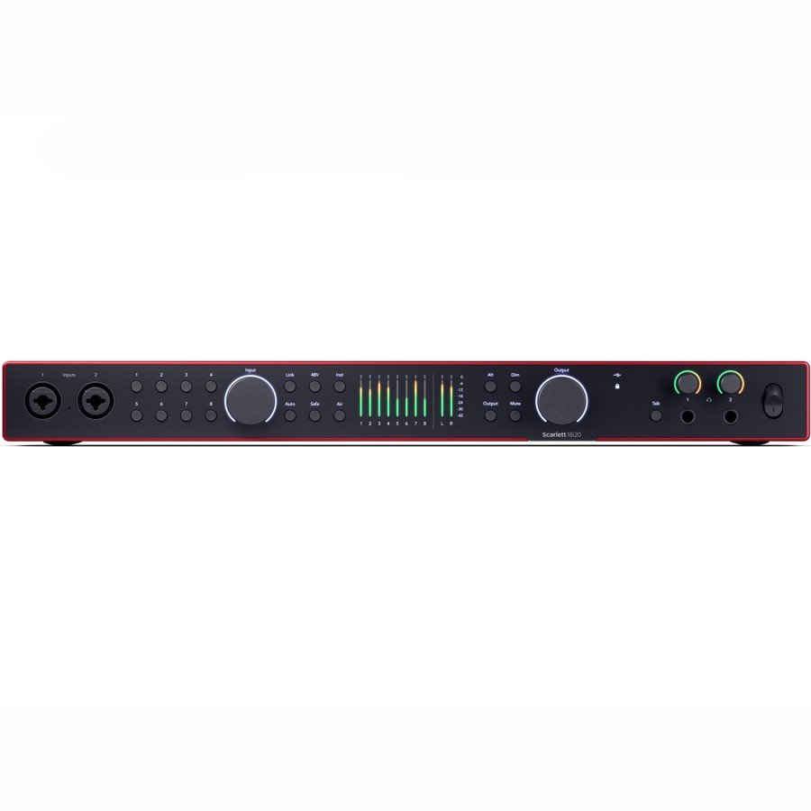 Designed for serious producers, engineers, and recording studios, the Scarlett 18i20 delivers professional-grade 24-bit / 192 kHz audio with 18 inputs and 20 outputs—perfect for full-band tracking, multi-mic setups, and complex routing. Featuring eight world-class mic preamps, ADAT and S/PDIF digital I/O, dual headphone outputs, word clock out, and advanced software control, this 1U rackmount interface brings unbeatable flexibility and sonic performance to any studio. With premium features like Air Mode, Auto Gain, Clip Safe, and loopback, the Scarlett 18i20 is built for pristine recordings and effortless workflow.